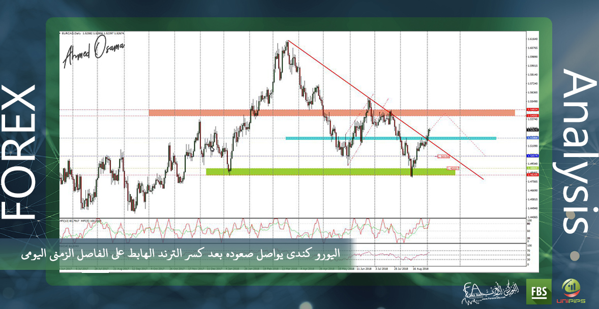 اليورو مقابل الدولار كندى مازال محافظ على صعوده بقوة منذ بداية الارتداد من مناطق الطلب الممتدة بين مستويات 1.4820 حتى 1.4886 وهو ما ساعد على الصعود حتى الان 450 نقطة تقريبا لتستقر تداولاته الان عند مستويات 1.5267 حيث استطاع الزوج كسر الترند الهابط على الفاصل الزمنى اليومى والاغلاق أعلاه بشمعة يوم مما يزيد من فرص الزوج فى استكمال الصعود خاصة بعد أن استطاع الزوج كسر اخر قمة له ويدل ذلك على بداية تحول الاتجاه الى الصاعد .