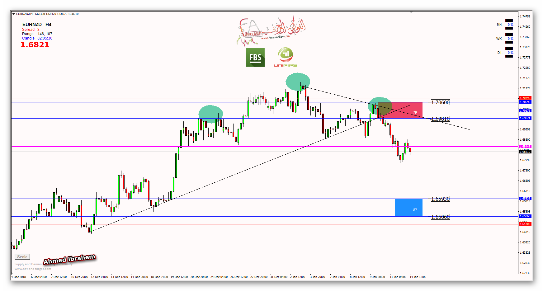 يتداول زوج اليورو نيوزيلندي حاليا عند مستويات 1.6825 بعد كسر الترند الصاعد وتأكيد الكسر بتكوين نموذج