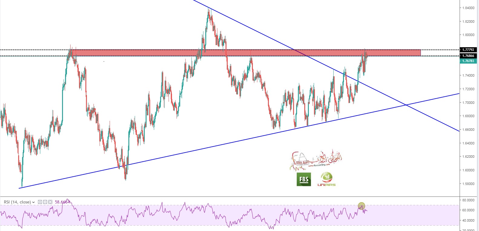 وصل الزوج الى منطقه مقاومه مهمه للغايه على الفريم اليومى داخل مستويات 1.7685-1.778
