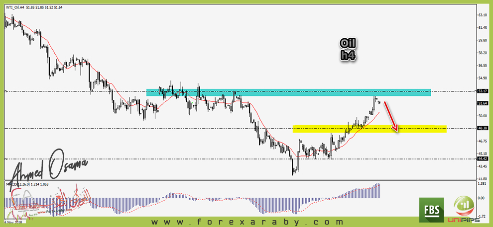 ويواجه النفط مستويات مقاومة قوية متمثلة فى مستويات 53 بدأ بالفعل فى الارتداد منها ومن المتوقع أن يستمر هبوطه حتى مستويات 48 دولار للبرميل نتيجة لضعف الاتجاه الصاعد ومنطقة المقاومة .