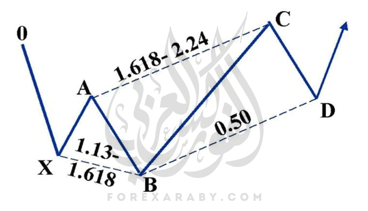 بعد انعكاس الضلع BC من تلك المنطقة ، يتم قياس تصحيح فيبوناتشي عند 50٪ من النقطة B إلى النقطة C. لتكتمل النقطة D ، ومعها يكتمل النموذج