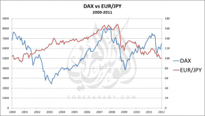 مما يؤدي إلى انخفاض قيم مؤشر DAX وS&P500. مع تدفق الأموال من هذه الأسواق، عادة ما نرى انخفاض زوج اليورو/الين الياباني مع هروب المتداولين بحثًا عن غطاء. على الجانب الآخر، عندما تكون الشمس مشرقة وتكون الرغبة في المخاطرة متفشية، يقوم المستثمرون بصب أموالهم في أسواق الأسهم، الأمر الذي يؤدي بدوره إلى ارتفاع زوج اليورو/الين الياباني. قم بإلقاء نظرة على الرسوم البيانية أدناه لمعرفة العلاقة بين زوج اليورو/الين الياباني ومؤشر DAX وS&P500.