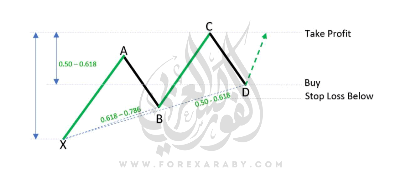 مع اكتمال الصعود يحدث تصحيح وينخفض السعر عند B بين 61.8٪ – 78.6٪ فيبوناتشي من الضلع XA.