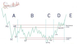 عملية التجميع في نظرية وايكوف تحدث بعد ترند هابط بمعني أن السوق يتحرك في اتجاه عام هابط ويبدء في الحركة العرضية
