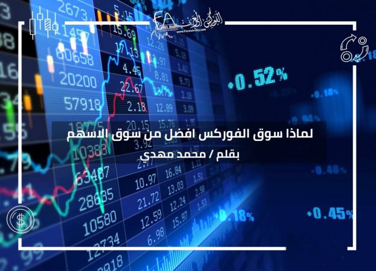 * إمكانيات أو احتمالات الربح اكثر بكثير من سوق الاسهم حيث يمكن تحقيق الربح في كلا الاتجاهين سواء السوق صاعدا أو هابطا اما سوق الاسهم معظم المتداولين والمستثمرين يربحون فقط أثناء صعود السوق