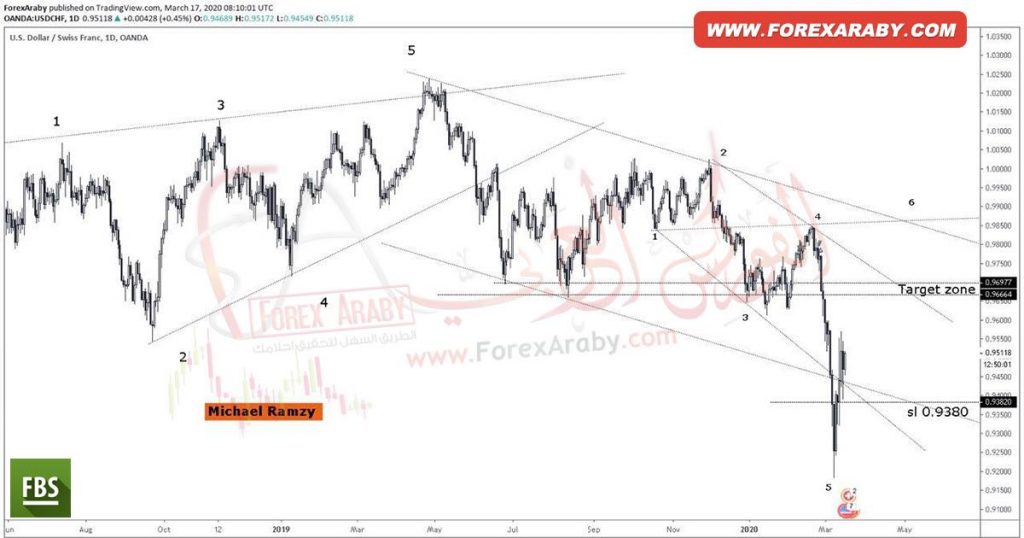 بالنظر إلى الرسم البياني لزوج الدولار مقابل الفرنك فاصل زمني يومي نجد أن الزوج يتداول ضمن تركيبة ولفي إيجابية اكتملت (٥) نقاط كما هو موضح بالشكل لذلك نميل نحو توقع تحقيق مزيد من الصعود للزوج لتحقيق نقطة (٦) للنموذج باستهداف مستويات 0.9666 و 0.9700 و باختراق الأخير يفتح الزوج الطريق نحو 0.9850 كمستهدف كامل للنموذج.